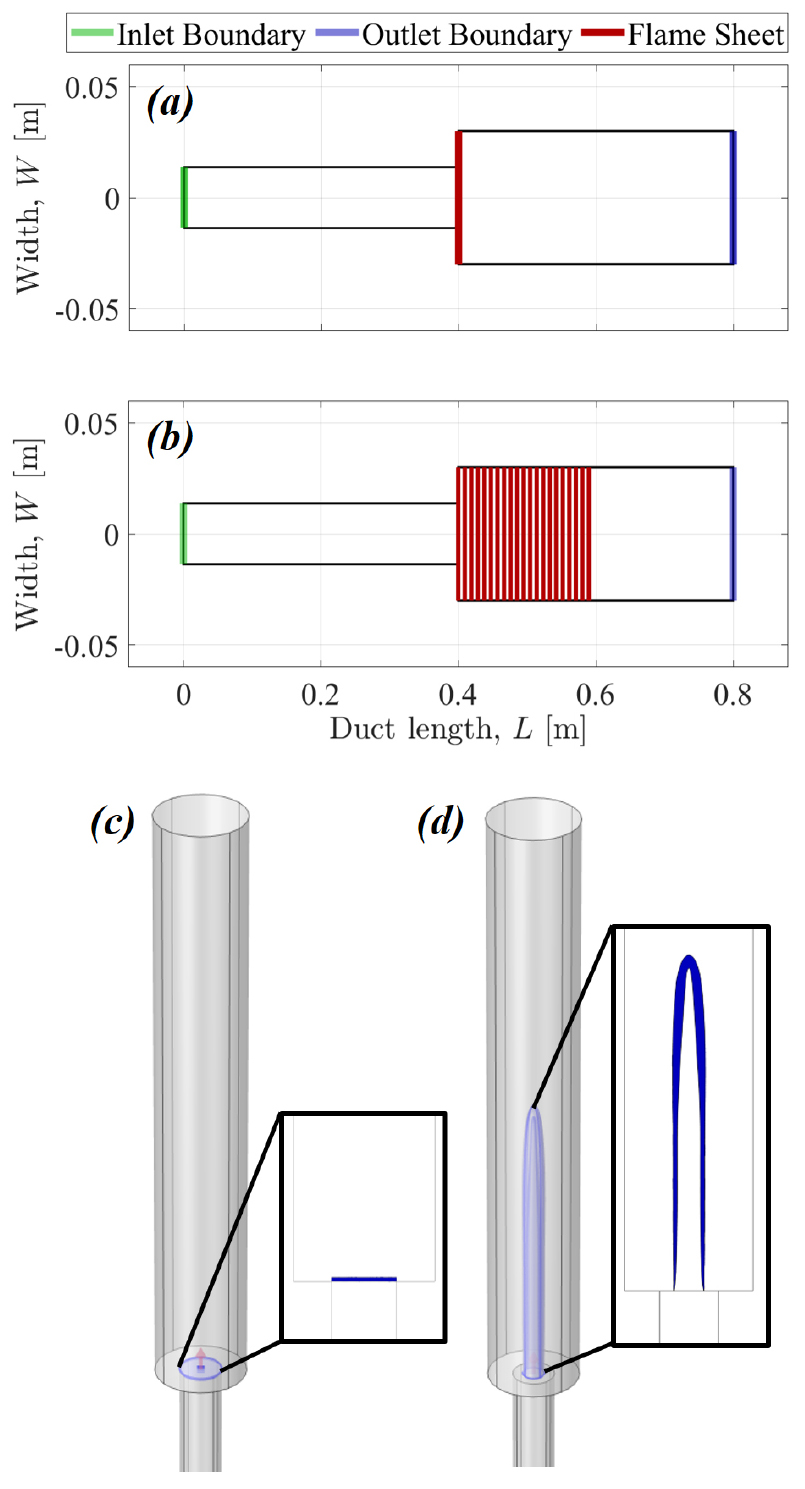 - The thermoacoustic network model is a low-order modeling approach used to analyze and predict thermoacoustic instabilities arising from the positive interaction between unsteady heat release and a combustor’s acoustic field. In this study, we question the conventional assumption of a compact flame in thermoacoustic network models by systematically analyzing the effect of flame length on this low-order framework. We first compare the growth rates and mode frequencies of thin and long flames using a three-dimensional analysis tool, revealing a clear discrepancy between the two cases. We then evaluate a one-dimensional network modeling strategy that segments the flame. The results indicate that both the thin-flame assumption and the segmented-flame approach fail to reproduce the full thermoacoustic dynamics within the combustor. We also investigate the influence of varying gain and time delay parameters on growth rates and mode frequencies. The findings of this study demonstrate that flame length has a significant impact on thermoacoustic behavior, and this influence should be appropriately incorporated into low-order thermoacoustic models. Based on these observations, we suggest future research directions for improving existing thermoacoustic network models. - COLLAPSE